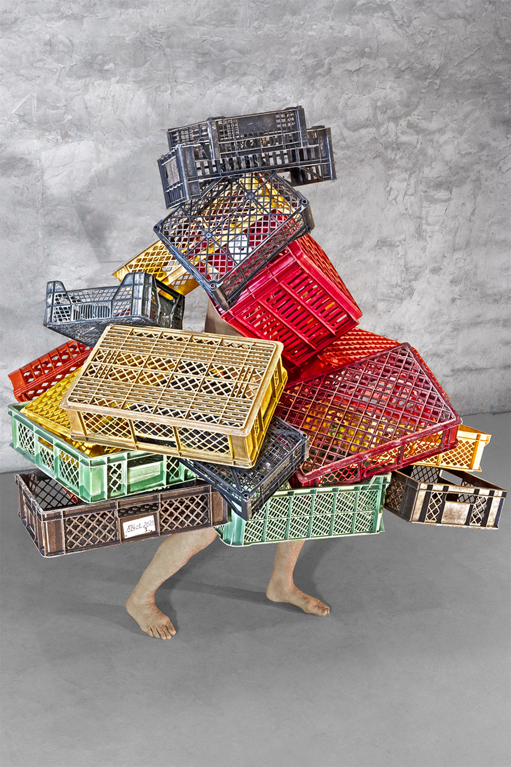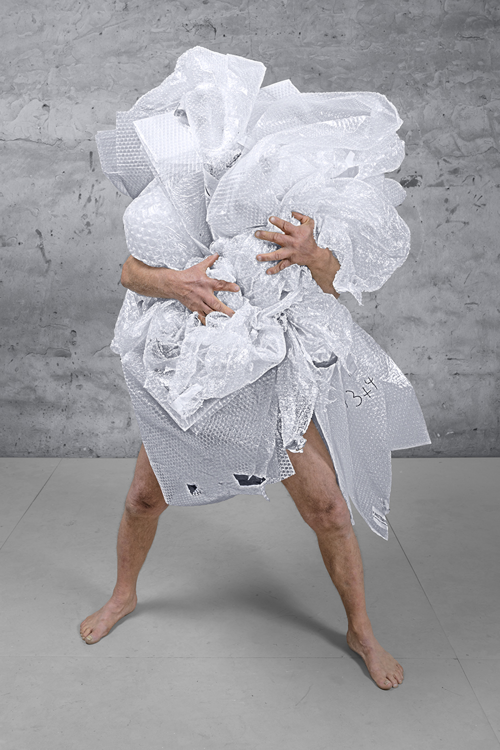 Im Moment der maximalen Belastung eines Körpers mit Gegenständen wurde das Bild ausgelöst. Es entstand eine 8-teilige Serie in Großformaten, kaschiert auf Alu-Dibond.